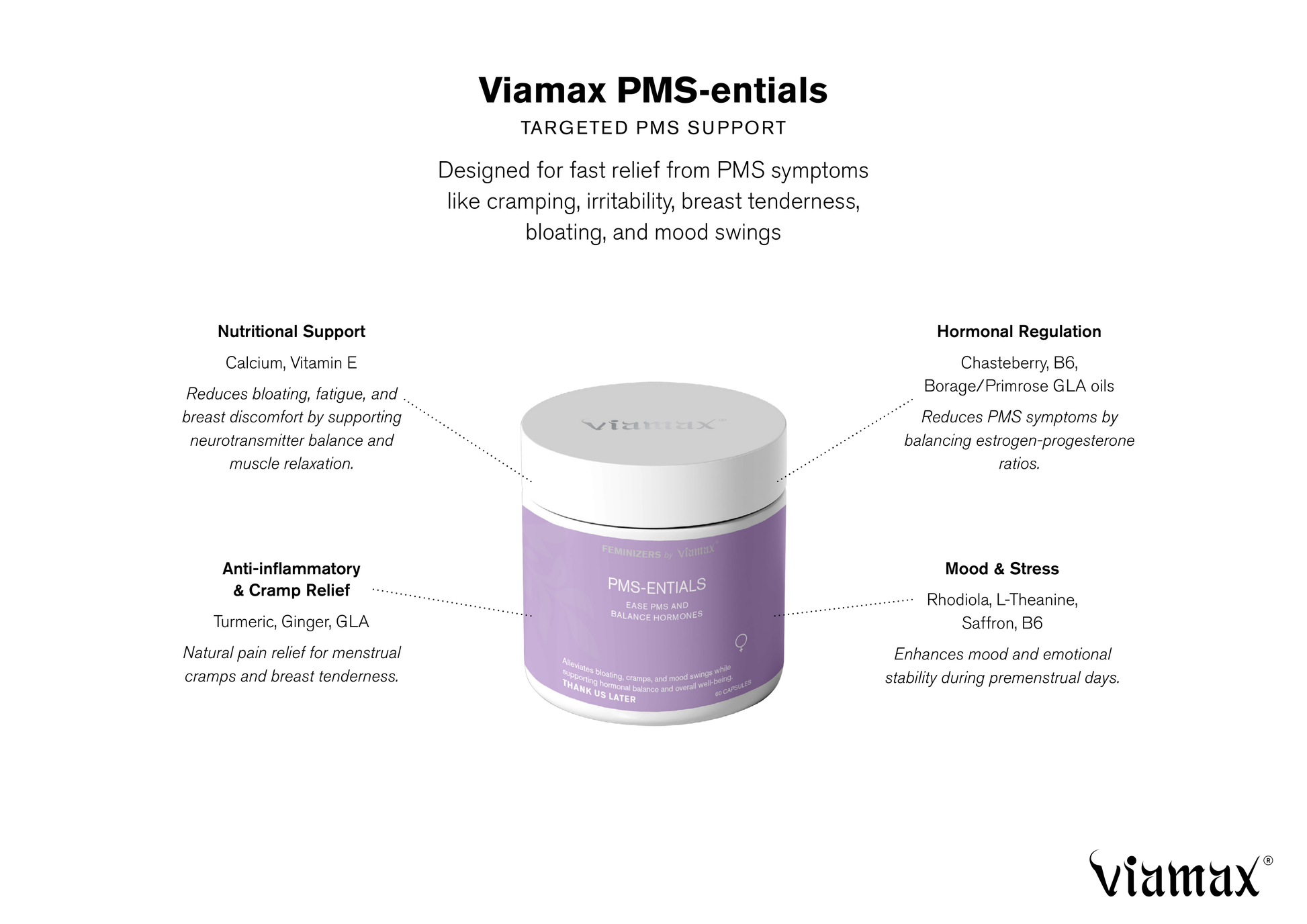Viamax PMSentials – Apoyo natural para el equilibrio, el bienestar y la armonía hormonal.